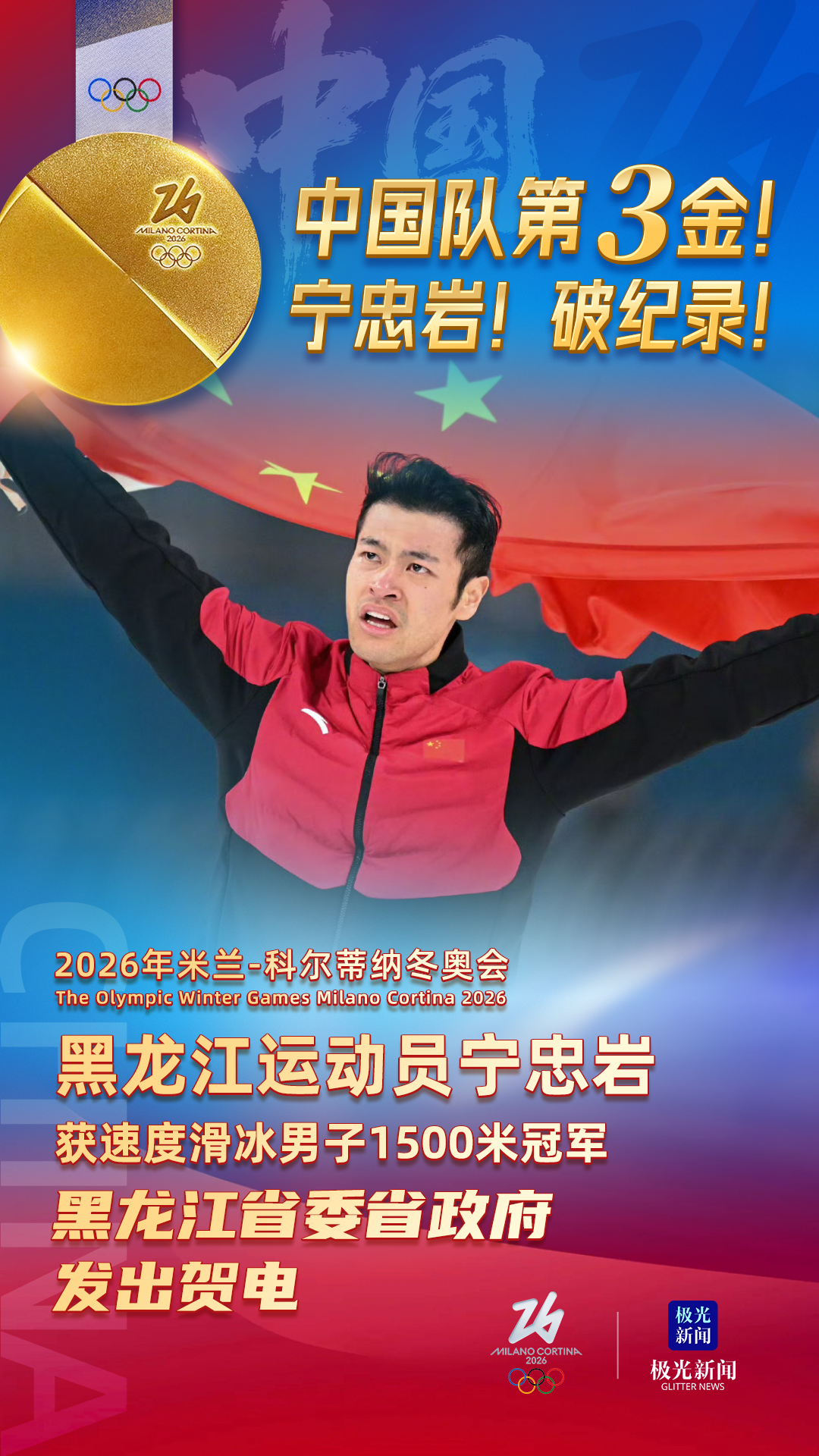 黑龙江运动员宁泉岩 获速度滑冰男子1500米冠军 2026年米兰-科尔蒂纳各奥会 The Olympic Winter Games Milano Cortina 2026 ■队第3金 " 开学! 假年5. 黑龙肛省委省政府 发出贺电 极光 新闻 MILANO CORTINA 极光新闻 NEWS data ...
