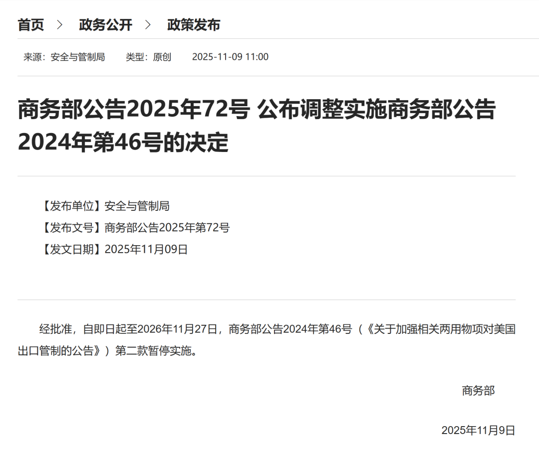 Core Points - The Ministry of Commerce announced the suspension of the implementation of Announcement No. 46 of 2024 regarding export controls on dual-use items to the United States, effective immediately until November 27, 2026 [1] Group 1: Export Control Measures - The original Announcement No. 46 of 2024 aimed to strengthen export controls on dual-use items to the United States, citing national security and international obligations [2] - The announcement included a ban on the export of dual-use items to U.S. military users or for military purposes [2] - It also stated that exports of gallium, germanium, antimony, and related dual-use items to the U.S. would generally not be permitted, with stricter end-user and end-use reviews for graphite dual-use items [2] Group 2: Legal Implications - Organizations and individuals that violate these regulations by transferring or providing relevant dual-use items originating from China to U.S. entities will face legal consequences [2]