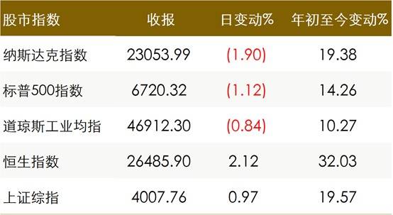 美国10月裁员规模创逾20年来同期最高,多位美联储官员对通胀问题表示关切。特朗普政府将铜、煤 炭、白银等列入关键矿产清单。 隔夜要点 美国股市三大股指周四全线下跌,科技股大跌再度上演,因投资者正在应对估值过高的问题,对股价虚 高的担忧抑制了风险偏好。美国公债收益率下跌,因市场担心美国劳动力市场疲软,以及华盛顿政府停 摆和对特朗普总统关税合法性的质疑可能导致更多不确定性。美元兑欧元和瑞郎连续第二个交易日下 跌,就业数据增加了对美联储今年内再次降息的预期。油价下跌,因投资者考虑到潜在的供应过剩以及 世界最大石油消费国美国的需求减弱。金价收盘小跌,盘中上涨,受美元走软以及投资者担忧导致避险 需求回升的提振。 | 股市指数 | 收报 | 日变动% | 年初至今变动% | | --- | --- | --- | --- | | 纳斯达克指数 | 23053.99 | (1.90) | 19.38 | | 标普500指数 | 6720.32 | (1.12) | 14.26 | | 道琼斯工业均指 | 46912.30 | (0.84) | 10.27 | | 恒生指数 | 26485.90 | 2.12 | 32.03 ...
