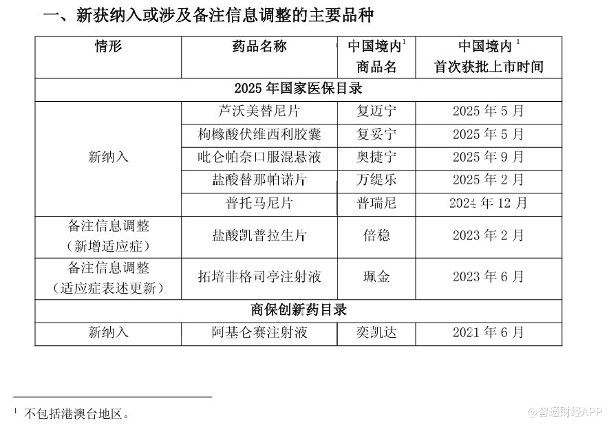 2025年国家医保目录、商保创新药目录将于2026年1月1日起执行。其中,2025年国家医保目录的具体医保支付标准、医保报 销细则、谈判药品的协议有效期等信息,须以国家医疗保障局等相关政府部门公示信息为准。 复星医药(600196)(02196)发布公告,根据2025年12月7日国家医疗保障局、人力资源社会保障部发布的《国家基本医疗保 险、生育保险和工伤保险药品目录(2025年)》(以下简称"2025年国家医保目录")以及首次发布的《商业健康保险创新药品目录 (2025年)》(以下简称"商保创新药目录"),上海复星医药(集团)股份有限公司及控股子公司/单位(以下简称"本集团")多款已上市 产品获首次纳入或涉及备注信息调整,现将有关情况公告如下: | 情形 | 药品名称 | 中国境内 | 中国境内 | | --- | --- | --- | --- | | | | 商品名 | 首次获批上市时间 | | 2025 年国家医保目录 | | | | | 新纳入 | 芦沃美替尼片 | 复迈宁 | 2025年5月 | | 枸橡酸伏维西利胶囊 | | 复妥宁 | 2025年5月 | | 吡仑帕奈口服混悬液 | | 奥捷宁 ...