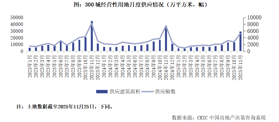 导 语 行业正处于新旧模式转型期,土地市场作为上游核心指标有望率先调整到位 ◎ 文 / 马千里 2025年11月,土地成交规模环比回升,同比降幅仍维持在二成。据月末快报数据显示,当月土地成交建筑面积和金额分别环比增长39%和57%;同比来看,二者分 别下降了27%和28%。供地规模进入年末放量周期,截至25日,本月土地供应建筑面积2.9亿平方米,环比上升250%,同比下降9%。从市场热度来看,本月溢价率 稍有回升,但土拍热度仍集中在少数优质地块,如北京朝阳南磨房、上海浦东川沙等,此外义乌也出现了超高溢价率的优质商办地块。 核心要点 正如统计局发言人在11月国新办发布会所言,当前房地产市场还处在新旧模式转换的时期,转型调整需要一定时间,在这个过程当中部分指 标会出现波动,对此要客观看待。而土地市场作为涉及行业的最上游指标,其指标调整幅度更为显著,也理应先一步调整到位。根据年内行 业统计数据预估,2025年全年土地成交建面仅为商品房成交的1.1倍(2020年为1.8倍),扣除不可售和尾盘部分,行业全口径新增供给已 经在事实上低于新房成交,2025年行业已正式迈入去库存新周期。 从月内住建部表态来看,未来将把城市更 ...