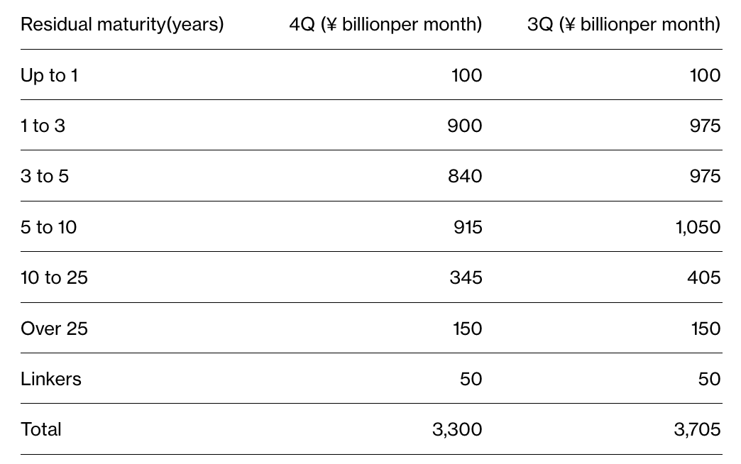 Group 1 - The Bank of Japan is reducing its monthly purchases of 10 to 25-year government bonds from 405 billion yen (approximately 2.3 billion USD) to 345 billion yen (approximately 2.3 billion USD) for the next quarter, while maintaining the purchase of bonds over 25 years at 150 billion yen [1][5] - The total monthly purchase of all maturities will decrease from 3.705 trillion yen to 3.3 trillion yen, indicating a gradual shift away from loose monetary policy [5] - The losses on long-term Japanese government bonds have been significant, with a decline of 9% this year, which is more than double the losses of bonds with shorter maturities [2][5] Group 2 - The reduction in bond purchases is seen as a slight negative factor for the bond market, as indicated by the comments from a senior strategist at Sumitomo Mitsui Trust Asset Management [2] - The decision to keep the purchase volume of bonds over 25 years unchanged is viewed positively, as it signals the Bank of Japan's cautious approach to avoid instability in the ultra-long-term bond market [6] - Market participants are increasingly expecting another interest rate hike in October, reflecting the Bank of Japan's gradual tightening stance [5]