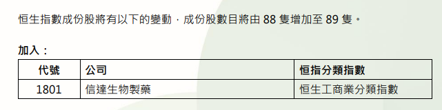 11月21日,恒生指数公司公布今年第三季度恒生指数系列季度检讨结果,所有变动将于2025年12月8日 起生效。 结果显示,信达生物获纳入恒生指数,成分股数目将由88只增加至89只。 | 代號 | 公司 | 恒指分類指數 | | --- | --- | --- | | 1801 | 信達生物製藥 | 恒生工商業分類指數 | 中国宏桥、信达生物、百胜中国获纳入恒生国企指数,新奥能源、海底捞、新东方-S则被剔除。 | 代號 | 公司 | | --- | --- | | 1378 | 中國宏橋集團有限公司 | | 1801 | 信建生物製藥 | | 9987 | 百勝中國控股有限公司 | 富卫集团、禾赛-W、奥克斯电气、极智嘉-W、银诺医药-B、奇瑞汽车获纳入恒生综合指数。 | 代號 | | | --- | --- | | 9973 | 奇瑞汽車股份有限公司 - H 股 | | 代號 | 公司 | | --- | --- | | 1828 | 富衛集團有限公司 | | 2525 | 禾賽科技 - W | | 2580 | 奥克斯電氣有限公司 | | 2590 | 北京極智嘉科技股份有限公司 - W - H 股 | | ...