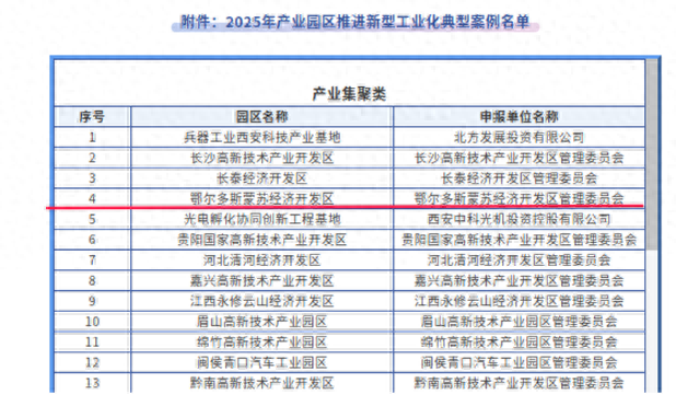鄂尔多斯蒙苏经济开发区。 鄂尔多斯蒙苏经济开发区是内蒙古工业园区转型发展的典型代表,为全区工业园区提质升级提供了示 范。近年来,内蒙古自治区工信厅深入贯彻国家关于推进新型工业化的战略部署,将工业园区作为实施 新型工业化的重要载体,陆续出台多项支持政策,着力理顺园区管理体制机制,持续完善基础设施配 套,积极承接产业转移,全面提升工业园区发展质效。 下一步,内蒙古自治区工信厅将推动各园区学习借鉴该开发区在基础设施、绿色能源、循环经济和标准 体系等方面的先进经验。同时,持续强化政策支持与精准服务,引导园区聚焦新质生产力,深化产业链 延链补链强链,加快培育一批具有内蒙古特色的新型工业化典范,为全区高质量发展注入新动能。 转自:草原云 记者11月19日从内蒙古自治区工信厅了解到,近日,工信部公示2025年产业园区推进新型工业化典型案 例名单,鄂尔多斯蒙苏经济开发区成功入选。 | | 并贴带示儿 | | | --- | --- | --- | | 序号 | 园区名称 | 申报单位名称 | | 1 | 兵器工业西安科技产业基地 | 北方发展投资有限公司 | | 5 | 长沙高新技术产业开发区 | 长沙高新技术产业开发区管理 ...