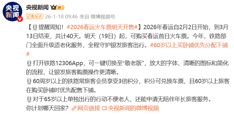 本文转自【央视新闻微博】; 2026年春运自2月2日开始,到3月13日结束,共计40天。明天(19日)起,可购买春运首日火车票。今年,铁 路部门全面升级适老化服务,全程守护银发旅客出行。 打开铁路12306App,可一键切换至"敬老版",放大的字体、清晰的图标和简化的流程,让银发旅客购票操作更 清晰。 60周岁以上的铁路常旅客会员享受3倍积分,积分可兑换车票,且60岁以上旅客在购买卧铺时优先配售下铺。 对于65岁以上单独出行的行动不便老人,还能申请无陪伴年长旅客服务。 你计划哪天回家? ...