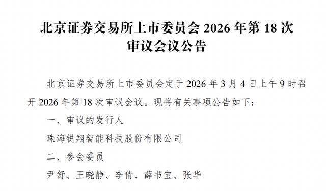 中国经济网北京2月27日讯 据北交所网站消息,北京证券交易所上市委员会定于2026年3月4日上午 9时召开2026年第18次审议会议,审议的发行人为珠海锐翔智能科技股份有限公司(以下简称"锐翔智 能")。 截至招股说明书签署日,锐翔产业直接持有公司35.38%的股权,为公司的控股股东,同时还通过 锐轩投资、横琴光州及横琴光城间接控制公司13.44%的股权,合计控制公司48.82%的股权。截至招股 说明书签署日,陈良华直接持有公司4.89%的股份,并通过锐翔产业、弦山控股、锐轩投资、横琴光州 及横琴光城间接控制公司49.68%的股份,合计控制公司54.57%的股份,为公司的实际控制人。 (责任编辑:何潇) 锐翔智能拟募集资金48,166.10万元,分别用于智能制造基地建设项目、研发中心建设项目、补充流 动资金。 锐翔智能本次发行的保荐机构为国泰海通证券股份有限公司,保荐代表人为朱云泽、王常浩。 ...