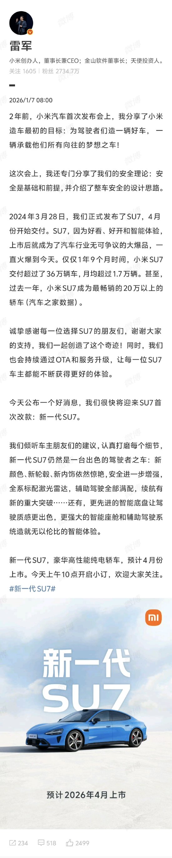 雷军官宣:新一代SU7要来了