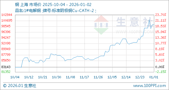 生意社01月02日讯 1月2日,生意社铜基准价为99180.00元/吨,与本月初持平。 新浪合作大平台期货开户 安全快捷有保障 | 当日价 | 99180.00 | | --- | --- | | 日涨幅 | 0.00% | | 一年位置 | 高位 | | 最小值 | 72408.33 | | 最大值 | 101053.33 | | 中位值 | 86730.83 | | 顶位差 | -1873.33 | | 底位差 | 26771.67 | | 平均值 | 80945.32 | | 警戒 | 1年超涨 2年超涨 3年超涨 | (文章来源:生意社) ...