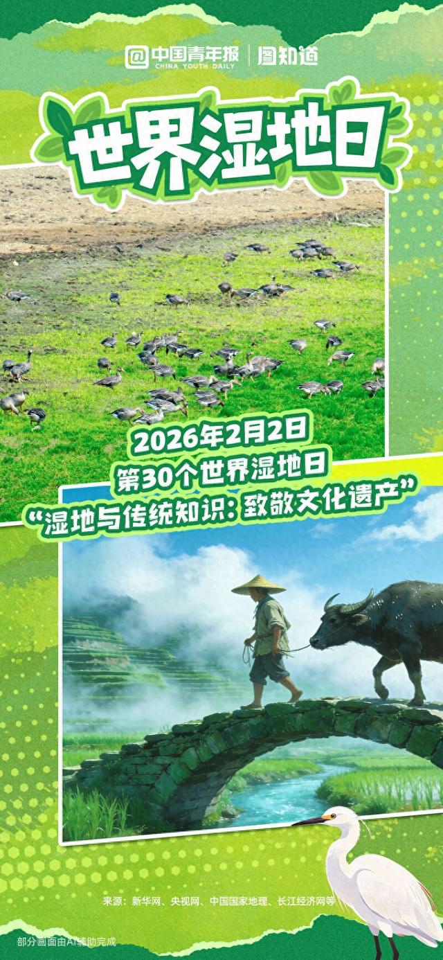 新华网、央视网、中国国家地理、长江经济网等 部分画面由Allab完成 中国青年报 | | 图 E 7 好 電 7 HEN ST 江南水乡, 先民依托河网密布的湿地环境, 因水造田、圩堤护水, 兼顾农田灌溉与水患防御, 体现了因水而生、顺水而治的智慧。 部分画面由Allab完成 2026年2月2日是第30个世界湿地日,主题为"湿地与传统知识:致敬文化遗产"。湿地是地球之肾,更是 中华传统生态智慧的藏宝库,桑基鱼塘、哈尼梯田等皆是先人与自然共生的答案。如今传统智慧融合现 代保护,中国湿地守护成效显著。守护湿地,就是守护生态之美与文化根脉! 部分画面由Allab完成。 中国青年旅 | 冒知道 鄱阳湖流域部分渔民 根据水位变化和鱼类繁殖规律, 形成了避开产卵期捕捞的传统经验, 有助于维持湖泊渔业资源。 中国青年报 | 冒知道 云南红河哈尼族地区, UA"森林一村寨一梯田- -河流" 相连的传统格局, 形成了持续千年的 农耕湿地生态系统。 部分画面由Alliab完成- 中国青年报 | 图知道 D =53 U I I M consine man 日時 博 the 在侗族聚居的稻作湿地区域, 人们在水稻田中养殖鱼鸭, 通过 ...