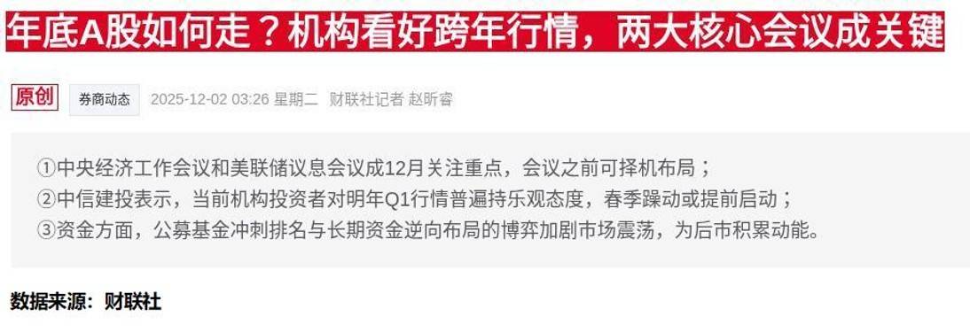 |2025年12月8日 星期一| 信达证券研报指出,9月以来市场缩量的内在原因是消化高换手率和部分板块交易拥挤,目前这两个原 因均有所缓和。本轮缩量震荡时间偏长,主要原因或在于当前市场资金面中,稳定的买入力量更多在于 中长期资金和产业资本,局部板块快速轮动的行情较难驱动居民资金大幅流入。另外也有年底存量机构 行为趋于稳健以及预期扰动下部分止盈资金离场的影响。但该机构认为当前时点可以保持乐观。一方 面,牛市中低成交量不是利空信号,事后来看,成交量低点大多情况下是牛市中较好的买入时点。 2005-2007年和2019-2021年,牛市中的调整或震荡期,成交量往往会快速萎缩。事后来看,成交量低点 通常也是市场阶段性低点。另一方面,历史上跨年行情启动之前,市场大多会先有一定的调整,本质上 是交易性资金为博弈跨年行情腾挪安全边际。2025年12月或成为布局跨年行情的窗口期。 NO.3 华西证券:跨年行情有望徐徐展开 华西证券认为,岁末年初,A股多路增量资金入市可以期待:一方面,海外美联储降息概率较大,人民 币汇率偏强运行有利于外资增配中国资产;另一方面,监管层下调保险资金股票投资风险因子和年初保 险资金"开门红"预期下 ...