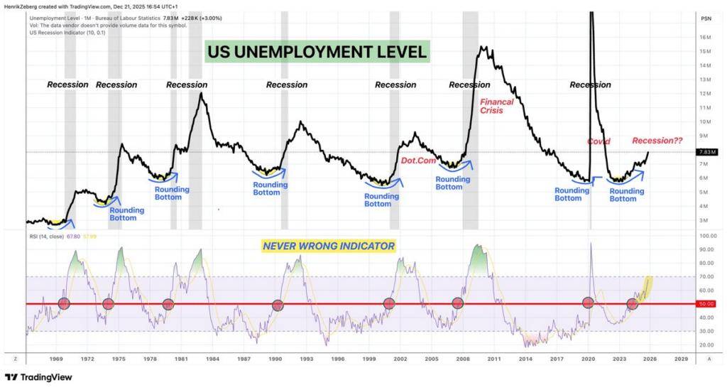 知名财经网站Finbold周日(12月21日)报道称,顶级经济学家亨里克·泽伯格(Henrik Zeberg)警告称,美国经济正在朝着不利方向发展,并认为美联 储未能识别出清晰信号——这些信号正指向一场严重的经济下滑。 (截图来源:Finbold) 财富管理公司Swissblock首席宏观经济学家泽伯格在12月21日发布的一条X帖子中表示,尽管政策制定者依然对其分析框架和预测工具充满信心, 但"重大衰退"的风险正在迅速上升。 他批评的核心在于:问题不是数据不足或专业能力不够,而是对经济形势的解读出现了根本性失误。 (衰退指标 来源:亨里克·泽伯格) 泽伯格强调,理解商业周期内部事件发生的正确先后顺序,是预判衰退的关键。 他指出,如果不能清晰把握经济各阶段如何展开并相互作用,那么即使投入多年研究、坐拥庞大的机构资源,也可能得出错误结论。他认为,正 是这种误读,使政策制定者对未来可能出现的情况准备不足。 这位经济学家的评估意味着,美联储目前的前景低估了即将到来的经济衰退的严重程度和时机。 尽管数据、研究能力和分析模型的获取前所未有,但泽伯格认为,美联储在对经济周期下一阶段没有清晰的认识的情况下仍在有效运作。 泽伯 ...