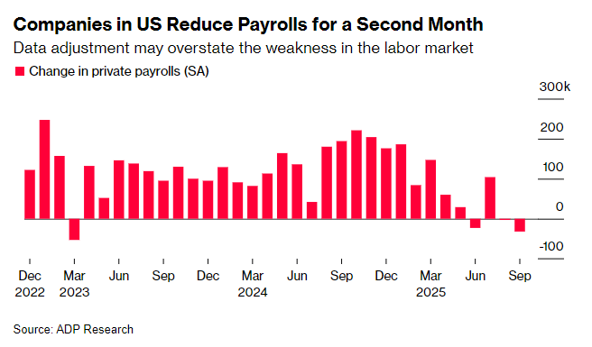 Core Insights - In September, the U.S. private sector experienced the largest decline in employment in two and a half years, indicating a weakening labor market, exacerbated by a government shutdown that has led to data reporting issues [1][3] - The ADP report revealed a loss of 32,000 jobs in September, contrasting with economists' expectations of an increase of 45,000 jobs [1][3] - The August employment data was revised down from an initial increase of 54,000 to a decrease of 3,000 [1] Employment Sector Analysis - Multiple sectors saw job reductions in September, with the education and healthcare sectors adding 33,000 jobs, partially offsetting the overall decline [3][4] - The leisure and hospitality sector lost 19,000 jobs due to the end of the vacation season, while other service sectors decreased by 16,000 jobs, professional and business services by 13,000, trade, transportation, and utilities by 7,000, and construction by 5,000 [3][4] - Service providers reduced 28,000 jobs, while goods-producing industries saw a decrease of 3,000 jobs [4] Business Size Impact - Small businesses with fewer than 50 employees lost 40,000 jobs, while larger companies with 500 or more employees added 33,000 jobs [4] Economic Growth Context - Despite a strong economic growth rate of 3.8% in Q2, the employment data reflects a cautious hiring attitude among U.S. employers [4] - The Atlanta Fed's GDPNow tool projects a Q3 growth rate of 3.9% [4] Labor Market Concerns - The current unemployment rate remains relatively low at 4.3%, but concerns about the labor market are increasing, with risks of labor demand falling below supply [6] - The market had anticipated an increase of 51,000 jobs in the upcoming Bureau of Labor Statistics (BLS) non-farm payroll report, which includes government jobs [6] Wage Growth Insights - Despite the slowdown in hiring, wages grew by 4.5% year-over-year in September, remaining stable compared to August, although the wage growth rate for job switchers fell to 6.6%, down 0.5 percentage points from August [6] Data Reporting Adjustments - The unexpected decline in employment numbers may also be attributed to data analysis issues, with ADP recalibrating past employment statistics based on the BLS's September benchmark data [6][7] - The QCEW data, which is used for annual adjustments of overall employment data, indicated a significant reduction of 911,000 jobs as of March this year [7]