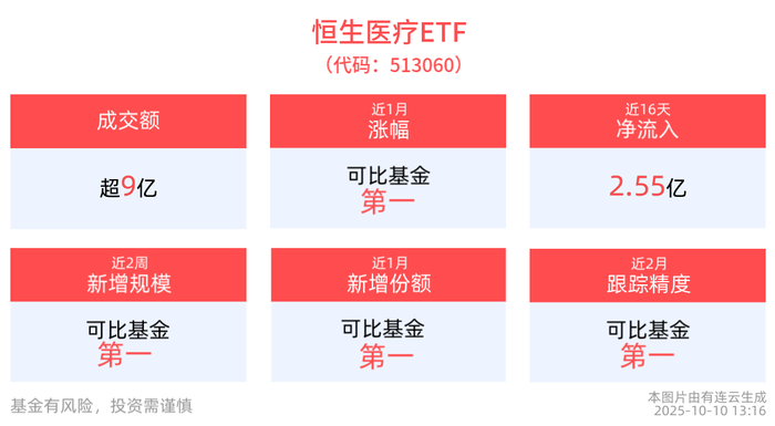 截至2025年10月10日 13:16,恒生医疗保健指数下跌1.16%。成分股方面涨跌互现,上美股份领涨 4.23%,脑动极光-B上涨4.02%,石药集团上涨2.23%;诺诚健华领跌9.63%,晶泰控股下跌6.67%,药捷 安康-B下跌5.43%。恒生医疗ETF(513060)下跌1.24%,最新报价0.72元。拉长时间看,截至2025年10月9 日,恒生医疗ETF近3月累计上涨25.95%,涨幅排名可比基金1/3。 流动性方面,恒生医疗ETF盘中换手12.99%,成交9.53亿元,市场交投活跃。拉长时间看,截至10月9 日,恒生医疗ETF近1月日均成交17.61亿元,居可比基金第一。 截至2025年10月10日 13:16,恒生港股通创新药精选指数下跌0.61%。成分股方面涨跌互现,石药集团 领涨2.23%,丽珠医药上涨1.45%,先声药业上涨1.35%;诺诚健华领跌9.63%,荣昌生物下跌7.86%,药 捷安康-B下跌5.43%。港股创新药精选ETF(520690)下跌0.89%,最新报价1元。拉长时间看,截至2025 年10月9日,港股创新药精选ETF成立以来累计上涨2.63%。 流动性方面,港股创新药 ...