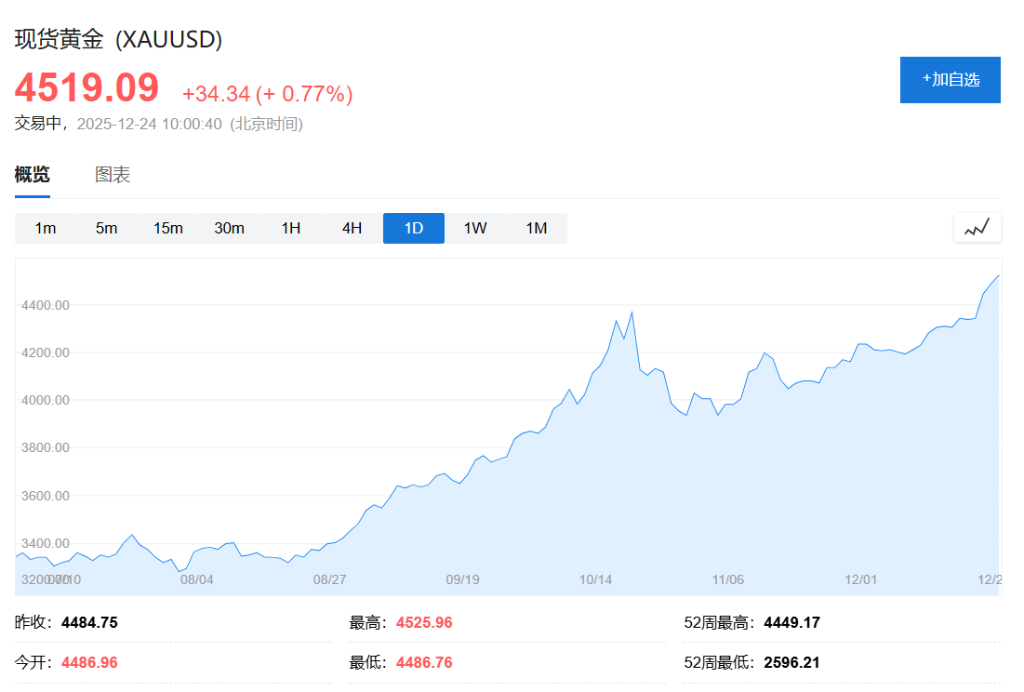 编辑 |苏琦 炒股就看金麒麟分析师研报,权威,专业,及时,全面,助您挖掘潜力主题机会! 美联储的政策动向一直是黄金市场的最重要风向标 文|《财经》特约撰稿人 金焱 发自华盛顿 经历前期短暂的震荡整理后,黄金市场再度走出强势单边行情,向历史高位发起新一轮冲击。12月22 日,国际金价率先发力,现货黄金盘中首次突破4400美元/盎司整数关口,刷新历史纪录,年内累计涨 幅进一步扩大。亚市早盘,现货黄金再度大幅攀升,金价刚刚触及4484.31美元/盎司,创下历史新高, 金价日内飙升逾40美元。黄金价格已是今年第50天刷新纪录。 过去一周,地缘政治紧张局势上升进一步放大了黄金的避险吸引力,尤其是在委内瑞拉:美国封锁油 轮,并加大对马杜罗(Nicolás Maduro)总统政府的施压力度。 2025年1月,黄金还在2614美元盎司左右。今年黄金年内涨幅接近70%,势将创下1979年以来的最大年 度涨幅。然而,在摩根大通分析师看来,金价未来一年仍有逾10%的上涨空间。 美元走弱、美国利率下行,以及经济和地缘政治不确定性,传统上都是推动金价上涨的积极因素,这些 因素都在本轮金价的上涨行情中发挥了作用。摩根大通指出,关税不确定 ...