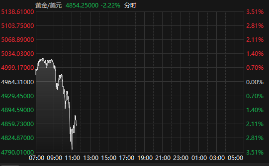 现货黄金小幅反弹 盘中一度跌破4800美元/盎司关口