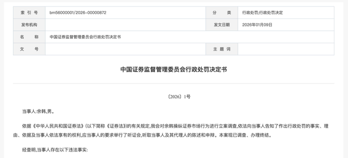 2026年以来,资本市场监管保持高压态势,从证监会到多地证监局,"1号罚单"密集落地。从个人天价 操纵市场,到会计师事务所审计失职,再到上市公司信息披露违规,监管火力覆盖市场参与各方,传递 出严监严管、净化生态的清晰信号。 10.22亿元重罚个人股价操纵 中国证监会2026年第一份行政处罚直指股价操纵。 1月9日,中国证监会披露的一则行政处罚书显示,当事人余韩在2019年6月25日至2024年8月16日期间, 控制使用"陈某某"等67个账户(以下简称"账户组")交易博士眼镜,违法所得5.11亿元。 在操纵期间,余韩通过集中资金优势、持股优势连续买卖,在自己实际控制的账户之间进行交易等手段 操纵博士眼镜,影响股票交易价格和交易量。 中国证监会表示,余韩的操纵行为对博士眼镜价量产生明显影响。操纵期间博士眼镜股票价格从13.72 元/股上涨至37.81元/股,涨幅达175.58%。同期,深证成指下跌9.36%,偏离184.94个百分点。 依据相关规定,中国证监会决定没收余韩违法所得5.11亿元,并处以等额罚款,共计罚没10.22亿元,同 时对其采取3年证券市场禁入和3年证券市场禁止交易措施。 记者了解到,该案贯穿长 ...