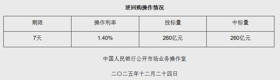 12月24日央行开展260亿元7天期逆回购操作