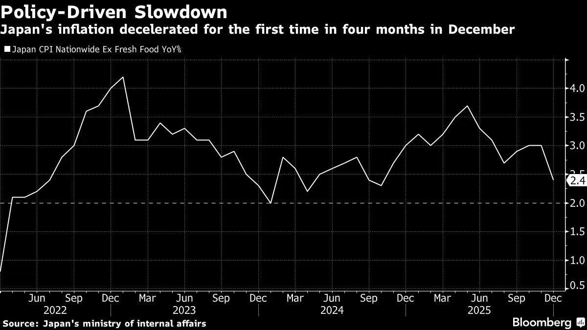 日本12月核心CPI年率录得2.4%,为2024年10月以来最小增幅,但仍高于央行2%的目标水平,这维持了 市场对未来加息的预期。 (文章来源:新华财经) 日本央行行长植田和男可能不会就下次加息时机给出太多线索,因为首相高市早苗决定下月提前大选引 发新一轮市场波动,使得这一决策变得复杂。日本央行一方面需要通过鹰派言论抑制日元空头,另一方 面又不能因为高市早苗政府可能大幅增加支出的预期而引发债券收益率进一步上升,目前处境微妙。 日本政府周四发布的经济报告基本维持了对经济的谨慎乐观态度,同时警告美国贸易政策带来的下行风 险。内阁府在1月份的月度经济评估报告中重申,作为世界第四大经济体的日本经济正在温和复苏,但 强调了美国政策可能对日本汽车行业造成的影响。报告还强调需要密切关注市场动向。 牛津经济研究院表示,如果日本央行仍落后于形势,期限溢价很可能会上升。日本国债收益率的上升将 使财政状况恶化,削弱日元,并加剧通胀预期,进而导致曲线进一步变陡的压力加大。市场预计日本央 行会先行采取行动,但结果可能会令他们失望。预计日本央行在2026年年中之前仅再加息一次,达到 1%的最终利率水平。 数据显示,12月份剔除生鲜食品的 ...