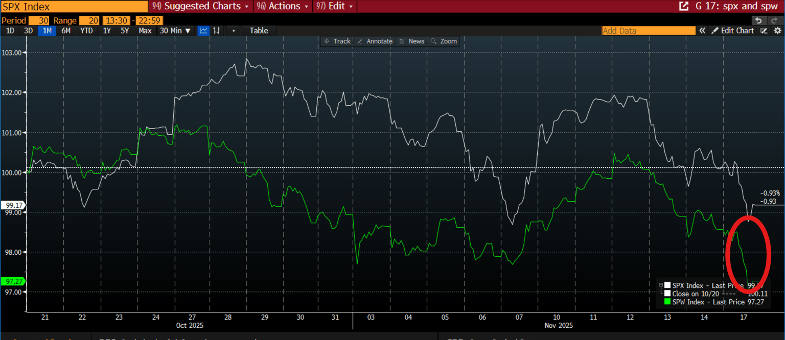 当前市场受多重因素驱动:对人工智能科技股估值的担忧、美国经济前景疲软的忧虑,以及美联储降息步伐可能不足的顾虑。就连传统避险资产今晨也显露 疲态,黄金每盎司下跌23美元,勉强守住4000美元关口。曾被视为"抗衰退"的奢侈品股正拖累欧洲股指下行。爱马仕和路威酩轩集团成为周二欧洲斯托克50 指数表现最差的个股,与荷兰巨头ASML等科技股同步下跌。外汇市场方面,日元和瑞郎正展现其避险货币属性,目前领涨十国集团货币。 周一跌幅超5%的美股涵盖航空、金融及科技股等广泛领域,表明抛售已超出科技板块。这正是推动标普500指数跌破50日均线的关键因素之一,该信号预示 短期动能呈下行趋势。 全面抛售表明科技股仍将主导市场 欧洲和亚洲股市跟随美股下行。 奢侈品和黄金等避险资产表现疲软。 全面抛售可能扼杀市场更广泛复苏的希望。 美国特定因素拖累市场情绪。 沃尔玛能拯救股市吗? 周二早盘股市一片红海,抛售潮持续加剧。欧洲股指目前重挫,泛欧斯托克50指数下跌逾1%,富时100指数跌幅超过0.8%,可选消费品、工业和金融等周期 性板块同样遭受重创。 避险资产随市场情绪动摇 周一的行情走势同样值得密切关注。全球股市在美股开盘前基本保持平稳, ...