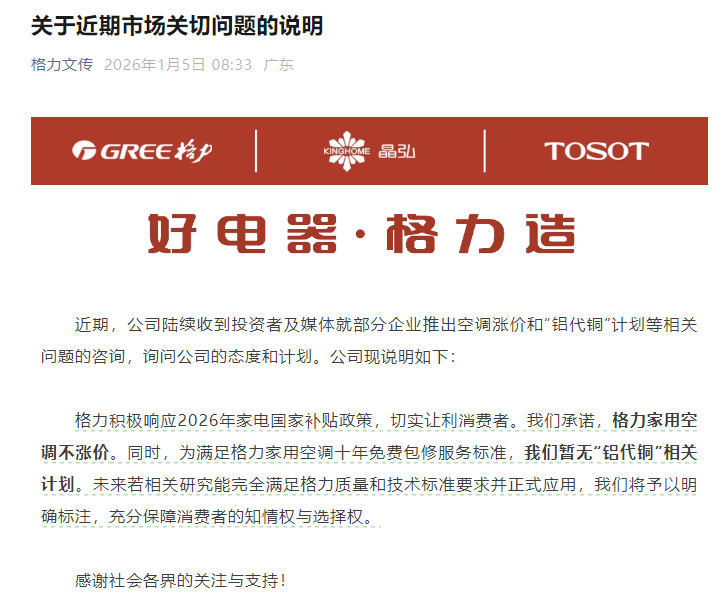 1月5日,格力电器通过其文化传媒中心官方公众号发布声明,就近期投资者和媒体关注的空调产品涨价 及部分企业推行"铝代铜"计划等问题作出回应。针对当前家电市场动态,格力表示将积极响应2026年国 家推出的家电补贴政策,切实履行企业责任,保障消费者利益。 性等方面仍与铜存在明显差距。因此,在技术尚未完全成熟前,格力不会贸然替换材料。公司强调,始 终重视新型材料的技术研发与行业发展趋势,将持续开展相关技术储备与研究工作。 1月5日,格力电器通过其文化传媒中心官方公众号发布声明,就近期投资者和媒体关注的空调产品涨价 及部分企业推行"铝代铜"计划等问题作出回应。针对当前家电市场动态,格力表示将积极响应2026年国 家推出的家电补贴政策,切实履行企业责任,保障消费者利益。 公司明确承诺,格力家用空调产品价格将保持稳定,不会进行上调。同时,为确保产品质量与服务标 准,尤其是匹配已实施的十年免费包修政策,格力目前没有推进"铝代铜"的相关计划。若未来在技术研 究取得突破,并且新材料应用能够完全满足格力严格的质量和技术要求,公司将在产品上作出清晰标 识,充分尊重并保障消费者的知情权和选择权。 此前在去年12月23日,格力已在互动平 ...