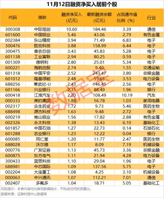 Market Overview - Major market indices opened lower but turned positive, with the ChiNext Index rising over 1% [1] - Lithium battery concept stocks saw a surge, with companies like Fuxiang Pharmaceutical and Huasheng Lithium hitting the 20% daily limit up [1] - The organic silicon concept led the gains among various sectors, followed by fluorochemical, metal lead, and sodium-ion battery concepts [1] Financing and Investment Trends - As of November 12, the total market financing balance was 2.48 trillion yuan, a decrease of 30.78 billion yuan from the previous trading day [1] - The non-ferrous metals sector saw the largest increase in financing balance, up 6.55 billion yuan, followed by communication, electronics, and transportation sectors with increases of 5.66 billion yuan, 4.83 billion yuan, and 2.86 billion yuan respectively [1] - Nineteen sectors experienced a decrease in financing balance, with the computer, power equipment, and automotive sectors seeing the largest reductions of 14.78 billion yuan, 13.04 billion yuan, and 7.50 billion yuan respectively [1] Individual Stock Performance - On November 12, 411 stocks received net financing purchases exceeding 10 million yuan, with 29 stocks having net purchases over 1 billion yuan [2] - The top net purchase was for Zhongji Xuchuang, with a net buy of 1.06 billion yuan, followed by China Aluminum and Dongshan Precision with net purchases of 546 million yuan and 394 million yuan respectively [2][3] Institutional Research Activity - In the past five trading days (November 6 to November 12), approximately 235 companies were researched by institutions, with 17 companies receiving over 50 institutional visits [4] - The company with the most institutional interest was BeiGene, with 203 institutions participating in the research. BeiGene is a leading global company focused on innovative cancer treatments [4] - BeiGene reported third-quarter revenue of 10.08 billion yuan, a year-on-year increase of 41.1%, and a net profit of 689 million yuan [4][5] Shareholder Actions - On November 13, 13 companies announced shareholding reduction plans, with Haodangjia and Hendi Pharmaceutical planning the largest reductions [6]
