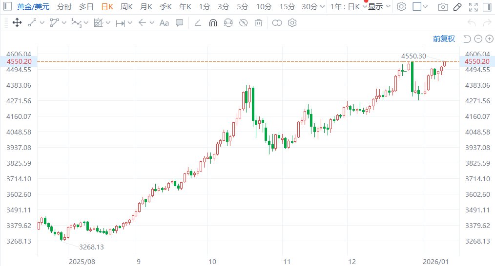 格隆汇1月12日|现货黄金周一涨至4550美元大关,时隔两周再度创下历史新高。消息面上,周末美国干涉伊朗局势的预期发酵。 ...
