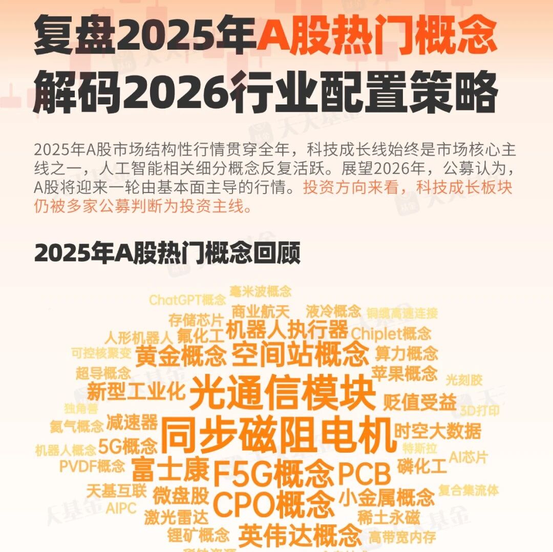 第一大事会 链接您与财富 l ( No. 型盘2025年A股热门槛 解码2026行业配置等 2025年A股市场结构性行情贯穿全年,科技成长线始终是市场核心主 线之一,人工智能相关细分概念反复活跃。展望2026年,公募认为, A股将迎来一轮由基本面主导的行情。投资方向来看,科技成长板块 仍被多家公募判断为投资主线。 2025年A股热门概念回顾 ir Chipleting 晨 优志 半刻胶 First JI→4 步被旧目 n 时空大数据 ■ IR 磷化工Al芯片 GTIFF 元来 令小金属概念 微信元 稀土永德 英伟达概念 高带宽内存 汽车热量理 注:字号越大表示2025年板块涨幅越大 2025年概念涨幅TOP10 No. 光通信模块 156.02% 165.05% No. F5G概念 128.33% N No. CPO概念 124.50% 同步磁阻电机 No. No. No. 空间站概念 PCB 富士康 5 0 112.11% 115.95% 111.68% No. No. No. 机器人执行器 英伟达概念 黄金概念 00 9 10 86.54% 104.45% 97.35% 展望2026年,公募行业主流观点认 ...