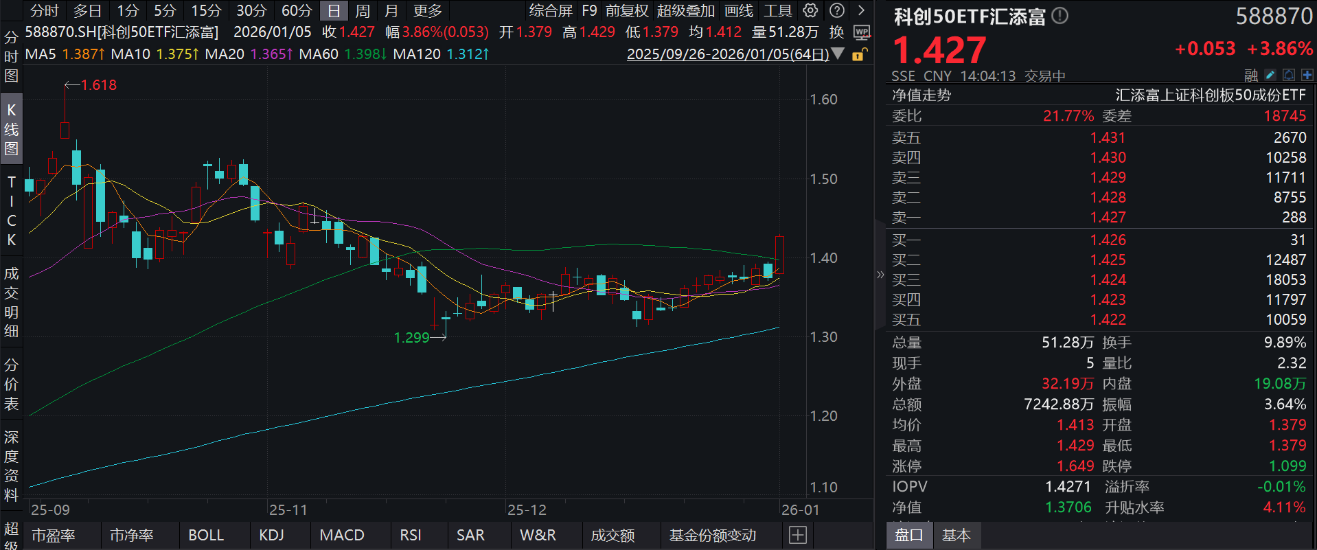 截至2026年1月5日 14:04,上证科创板50成份指数(000688)强势上涨4.16%,成分股中微公司(688012)上涨14.09%,澜起科技(688008)上涨8.41%,柏楚电子 (688188)上涨7.96%,佰维存储(688525),拓荆科技(688072)等个股跟涨。科创50ETF汇添富(588870)上涨3.86%,最新价报1.43元。拉长时间看,截至2025年 12月31日,科创50ETF汇添富近2周累计上涨2.84%。(以上所列股票仅为指数成份股,无特定推荐之意) 流动性方面,科创50ETF汇添富盘中换手9.89%,成交7242.88万元。拉长时间看,截至12月31日,科创50ETF汇添富近1年日均成交5445.20万元。 份额方面,科创50ETF汇添富近半年份额增长2.64亿份,实现显著增长。(数据来源:Wind) 数据显示,杠杆资金持续布局中。科创50ETF汇添富最新融资买入额达174.94万元,最新融资余额达808.45万元。(数据来源:Wind) 20CM抓反弹,首选"硬科技龙头"科创50ETF汇添富(588870)!资料显示,科创50ETF汇添富(588870)跟踪科创50指 ...