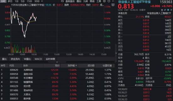 炒股就看金麒麟分析师研报,权威,专业,及时,全面,助您挖掘潜力主题机会! 11月24日早盘,英伟达产业链获利好,光模块表现活跃,光库科技领涨超14%,长芯博创、锐捷网络涨 超5%,中际旭创、新易盛等飘红。光模块含量超54%的创业板人工智能ETF(159363)场内下探逾1% 后再度翻红拉升,实时成交额近3亿元。 | 分时 多日 1分 5分 15分 30分 · | F9 盘前盘后 量加 九转 画线 工具 @ CO | 创业板人工智能ETF华宝 | 159363 | 159363[创业板人工程能ETF华宝] 10:36 价 0.813 温深 0.006(0.74%) 均价 0.810 股. | 0.87 3 | +0.006 +0.74% | | | | | | | | | | | | | | | --- | --- | --- | --- | --- | --- | --- | --- | --- | --- | --- | --- | --- | --- | --- | --- | --- | --- | --- | --- | | 0.82 | B/ 0 + | SZSE CNY 10:36:33 交易中 ...