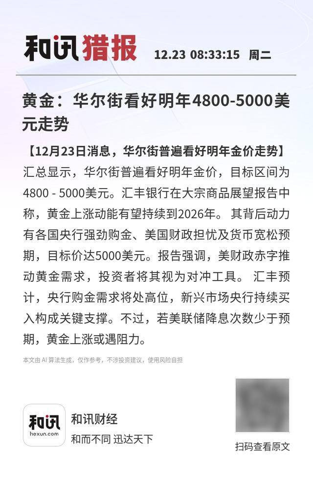 【12月23日消息,华尔街普遍看好明年金价走势】汇总显示,华尔街普遍看好明年金价,目标区间为 4800 - 5000美元。汇丰银行在大宗商品展望报告中称,黄金上涨动能有望持续到2026年。其背后动力有 各国央行强劲购金、美国财政担忧及货币宽松预期,目标价达5000美元。报告强调,美财政赤字推动黄 金需求,投资者将其视为对冲工具。汇丰预计,央行购金需求将处高位,新兴市场央行持续买入构成关 键支撑。不过,若美联储降息次数少于预期,黄金上涨或遇阻力。 本文由 AI 算法生成,仅作参考,不涉投资建议,使用风险自担 【12月23日消息,华尔街普遍看好明年金价走势】 汇总显示,华尔街普遍看好明年金价,目标区间为 4800 - 5000美元。汇丰银行在大宗商品展望报告中 称,黄金上涨动能有望持续到2026年。其背后动力 有各国央行强劲购金、美国财政担忧及货币宽松预 期,目标价达5000美元。报告强调,美财政赤字推 动黄金需求,投资者将其视为对冲工具。汇丰预 计,央行购金需求将处高位,新兴市场央行持续买 入构成关键支撑。不过,若美联储降息次数少于预 期,黄金上涨或遇阻力。 本文由 Al 算法生成,仅作参考,不涉投资建议,使用 ...