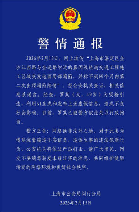 Core Viewpoint - The news highlights the issue of misinformation on social media, specifically regarding a false report about a ground subsidence incident in Shanghai's Jiading District, which was later confirmed to be a rumor [1] Group 1 - The police confirmed that the information about the ground subsidence near the Jia-Min Line construction area was false and originated from an individual named Luo, who used AI to generate and disseminate the misleading information [1] - Luo, a 49-year-old woman, was detained by the police for administrative reasons due to her actions aimed at gaining followers and creating a negative social impact [1] - The police issued a warning emphasizing that the internet is not a lawless space and that they will take strict action against those who fabricate false information for the purpose of gaining attention [1] Group 2 - The police urged the public and internet users to refrain from sharing unverified information to help maintain a healthy online environment and social order [1]