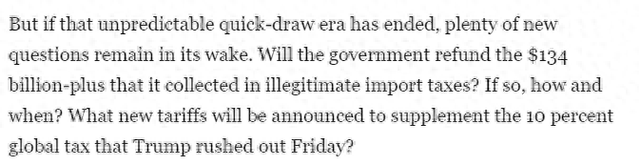 当地时间2月21日,美国《华盛顿邮报》发文称,美最高法院近日裁决美政府紧急关税政策无效,这结 束了一个经济不确定性的"篇章",同时也开启了另一个不确定性的"篇章"。 《华盛顿 邮报》网站报道截图 《华盛顿邮报》网站报道截图 文章称,尽管美国最高法院裁定特朗普总统对几乎所有国家的商品加征关税的做法超越了他的权限,但 特朗普在白宫新闻发布会上明确表示,他决心动用"其他选项",继续推行关税政策,而制定"B计划"需 要数月时间,这意味着关税引发的混乱局面将继续影响经济。特朗普已于2月20日迈出了第一步,下令 根据1974年贸易法第122条对所有进口商品加征10%的新关税。当地时间2月21日早上,他又将关税提高 到15%。 最高法院的这项裁决终结了一年多来总统"自由行事"的局面。但随之而来的还有许多新问题。政府是否 会退还其非法征收的超过1340亿美元的进口税?如果会,将如何退还?何时退还?除了新推出的加征全 球关税之外,还会宣布哪些新的关税措施? 文章说,美国司法部去年在法庭文件中表示,如果关税被推翻,政府将提供退款。但最高法院的裁决并 未就此问题提供任何指导,特朗普政府警告说,进口商和政府"最终将在未来五年里为此对 ...
