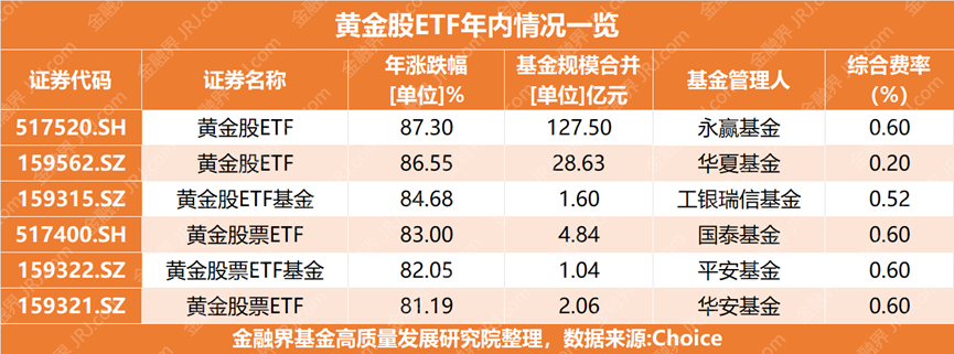 全市场6只黄金股ETF年内平均涨幅超过80%
