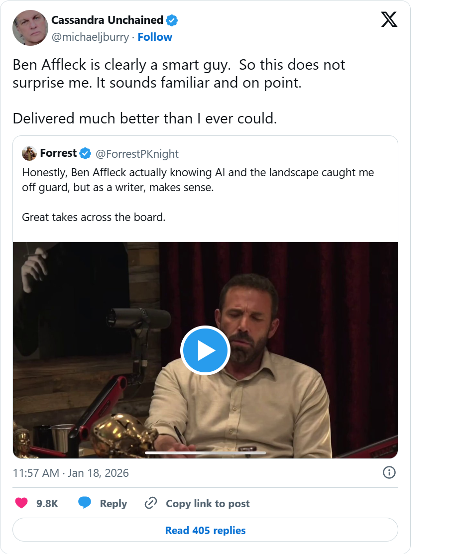 《大空头》原型人物迈克尔・伯里(Michael Burry)在反对人工智能(AI)炒作的战斗中找到了意想不到的同道中人:"蝙蝠侠"的扮演 者之一本・阿弗莱克(Ben Affleck)。 这位好莱坞影星在最新一期《乔・罗根访谈录》播客节目中直言,他与这位传奇投资者一样,对人工智能领域的夸大宣传,以及科技巨 头在这项新兴技术上的巨额投资感到质疑。 "我觉得这类论调大多出自那些急于为公司估值正名的人之口,他们会说:'两年内我们将颠覆一切,以后再也不用工作了。'"阿弗莱克说 道。 他补充道:"他们这么说的原因很简单,就是需要给出一个足以支撑其数据中心资本支出的投资估值。" 这位曾出演《正义联盟》、主演《消失的爱人》的演员指出,纵观历史,新技术的普及进程向来"缓慢"且循序渐进。 他表示,科技企业为了合理化自身的巨额投入,纷纷承诺将开发出远超现有水平的新一代人工智能模型;但现实是,每一代新模型的性 能仅有小幅提升,运行所需的电力与数据量却呈指数级增长。 "本・阿弗莱克显然是个聪明人。"伯里于上周末在社交平台X上发文称,"所以他的这番表态并不让我意外,听起来既耳熟又切中要害。" 英雄所见略同:阿弗莱克力挺伯里的AI批判 在 ...