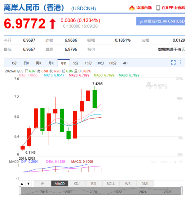 【文/观察者网专栏作者 梅新育】 2025年中国经济乃至世界经济影响最大的事件之一,就是人民币兑美元汇率从继续贬值直至低谷转入持 续升值轨道。尽管2025年全年年均汇率粗略估算应该还是低于上年,但从2025年4月月均汇率1美元兑 7.2034元的低谷,到2025年12月31日中间价1美元兑7.0288元,银行间外汇市场上人民币兑美元汇率连续 三年的贬值走势已被彻底扭转。 离岸人民币(CNH)兑美元汇率涨势更加迅猛,已经升值"破7"。2025年12月31日,纽约尾盘离岸人民 币(CNH)汇率为1美元兑6.9757元,比上一交易日纽约尾盘涨165点,日内整体交投区间为6.9945— 6.9752元。12月份离岸人民币累计上涨约950点,涨幅1.35%;四季度累计上涨约1500点,涨幅2.14%; 2025全年累计上涨约3600点,涨幅超过4.93%。 离岸人民币在2025年扭转贬值趋势,在年终重回"6时代"新浪财经 货币汇率是预期的产物,信用货币时代的汇率预期又是对该货币发行国经济、科技、军事实力预期的结 合。诚然,在2025年以来人民币兑美元汇率从贬值转入持续升值轨道的进程中,中国经济、科技实力的 显现是人民币 ...