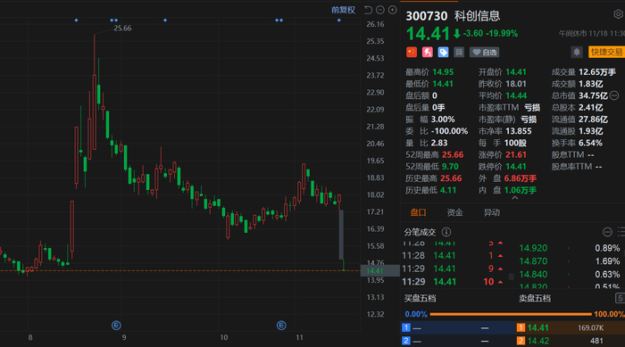 Core Viewpoint - Kexin Information (300730.SZ) has hit a trading limit down, reaching a new low of 14.41 yuan since early August, with a total market value of less than 3.5 billion yuan due to regulatory scrutiny from the China Securities Regulatory Commission (CSRC) [1] Group 1 - Kexin Information received a "Notice of Investigation" from the CSRC on November 17, 2025, for suspected violations of information disclosure laws [1] - The company did not disclose specific reasons for the investigation in its announcement, stating that all business activities are currently operating normally [1] - Kexin Information previously reported experiencing over 100 million yuan in contract fraud [1]