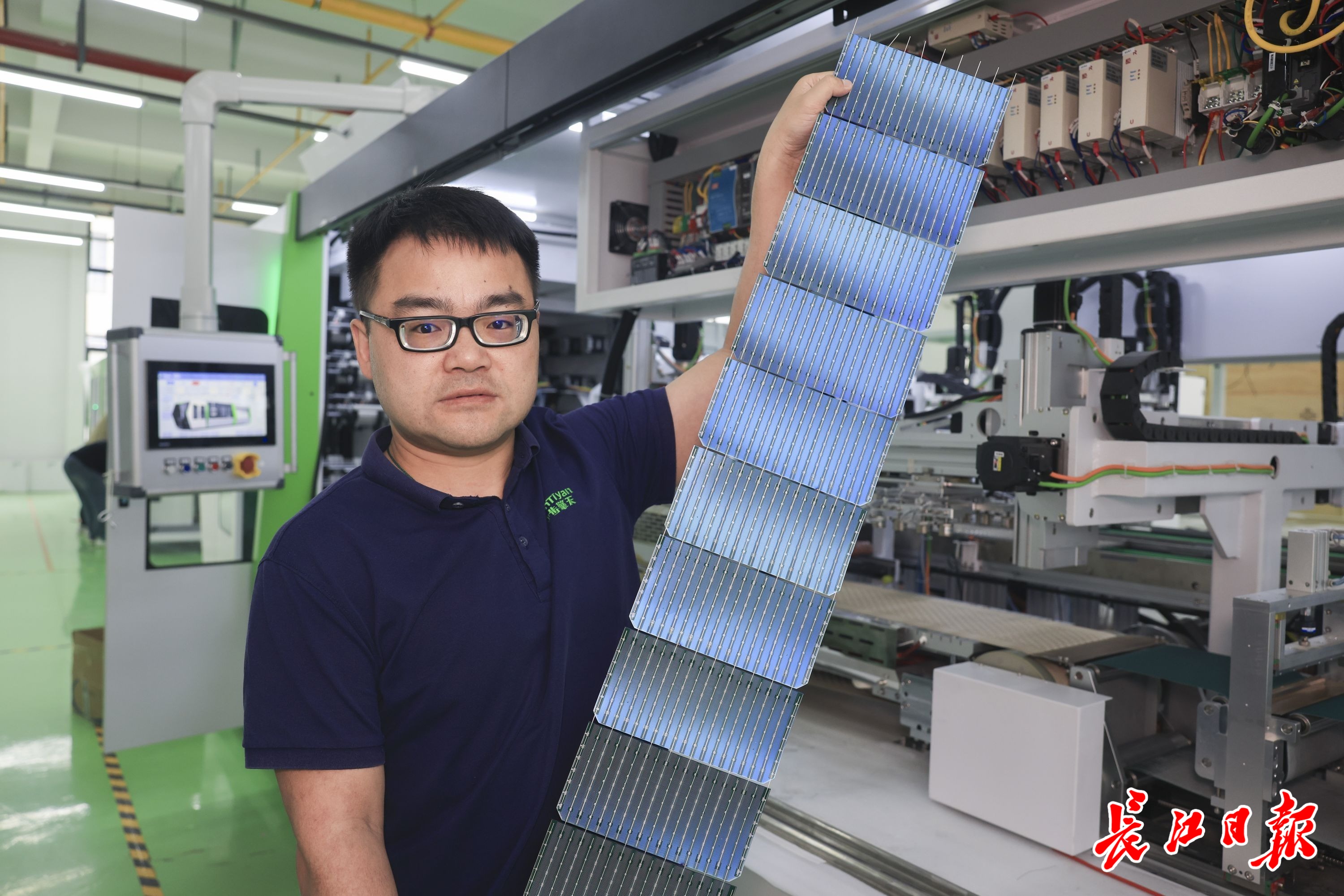 显然,电池片受阳光照射的面积越大,能转换的电能就越多,但焊接在上面的导丝却挡住了一部分阳光。我们为什么不把导丝全部焊 接在背面,使正面完全受光呢?早在30年前就有人提出这种"背接触式光伏电池板"(或称"BC光伏电池板")方案,但工艺实在太难了。 光伏电池片比纸还薄,又软又脆。如果把银丝全部焊接在电池片背后,电池片就会受力弯曲,甚至断裂。同时,一条光伏板上有上万 个2毫米宽的焊点,即便是最有经验的焊工也焊不了这么多精密焊点。受方案限制,光伏电池技术发展已经越来越接近极限,能把光电转 化效率提升0.1%都是技术上的大突破。 中步擎天新能源(湖北)有限公司负责人钟伟展示连接好的光伏电池片 眼前这台设备,有比人手更精密的机械臂,比人脑更准确的控制中心。把电池片和导丝放进送料口,它们跟着传送带一节节向前,送 入焊接环节。火光一闪,上万个焊点在1秒多的时间里同时完成焊接,电池片均匀受力,就不会弯曲或破碎。用手用力拨动导丝,导丝纹 丝不动,一条背接触式光伏电池板就像走了一遍"缝纫机""缝"好了、"缝"稳了。 屋顶和路灯上一块块光伏板,是用一根根细如发丝的银线导丝,连接一块块手掌大小的光伏电池片而成。 银线易断,电池片极脆, ...
