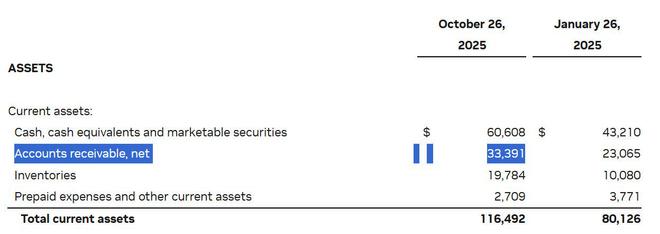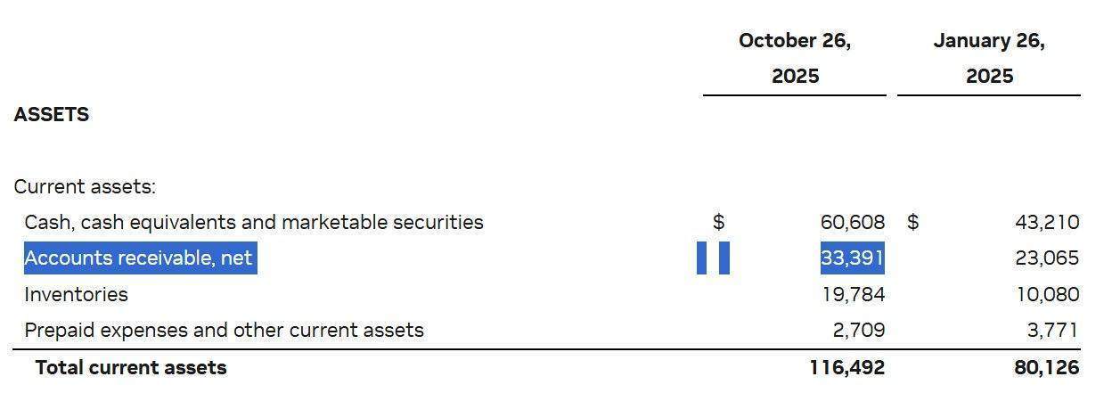 | | October 26, | | Janu | | --- | --- | --- | --- | | | 2025 | | 2 | | ASSETS | | | | | Current assets: | | | | | Cash, cash equivalents and marketable securities | $ | 60,608 | $ | | Accounts receivable, net | | 33,391 | | | Inventories | | 19,784 | | | Prepaid expenses and other current assets | | 2,709 | | | Total current assets | | 116.492 | | 格隆汇11月21日|金融市场独立研究员佩雷拉(Shanaka Anslem Perera)发文称,昨日,一场史无前例的剧变发生。英伟达股价在财报发布后飙升5%,却在18 小时内暴跌至负值区间。华尔街算法捕捉到了人类未能察觉的异常:账面数据存在严重矛盾。具体发现如下: 英伟达披露未结账款达334亿美元,一年内激增89%。购 ...