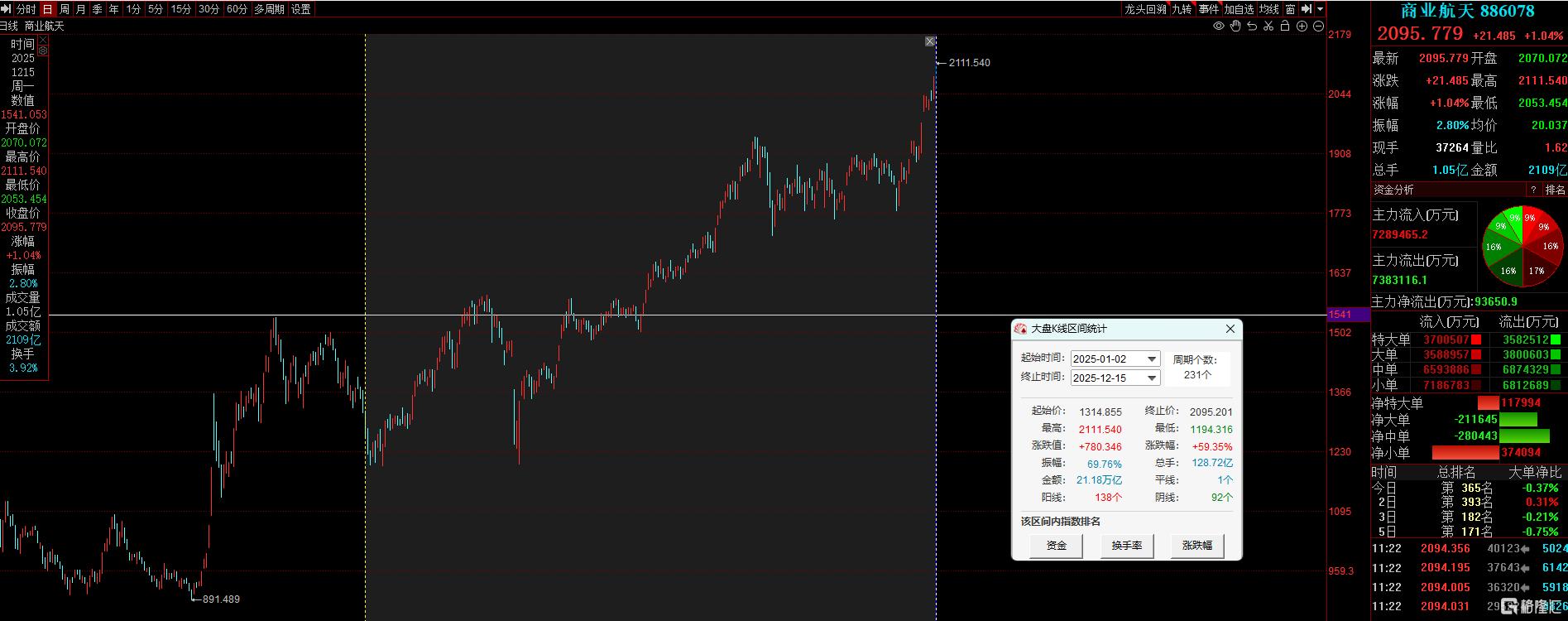 临近年末,市场行情反复震荡,板块热点轮动加速。 今天,A股主要指数疲弱,大消费整体转暖、科技概念回调,商业航天持续站上风口。 截至发稿,科强股份30CM涨停,雪人集团、中超控股、华菱线缆3连板、长城电工2连板,雷科防务、航天电子、星环科技、通宇通讯等多股涨停。 11月下旬以来,商业航天概念突然异军突起。 近大半个月期间,其累计涨幅超14%,多只个股走出连板行情,全市场联动效应明显。 放眼整体来看,该板块年初迄今更是一路高歌猛进,年内涨幅已近60%。 马斯克刷新商业航空天花板! 周末,"科技狂人"马斯克再度将商业航天推向热议高潮。 据悉,其旗下的SpaceX已敲定内部股票交易,估值约为8000亿美元。 12月12日,我国在海南商业航天发射场使用长征十二号运载火箭,成功发射卫星互联网低轨16组卫星。 另外近来,还有信维通信、震有科技等多家上市公司纷纷披露了在商业航天、卫星互联网领域的布局。 这也刺激了A股市场产业链的"躁动"。 年末主线之一? 这将超越今年10月OpenAI创下的5000亿美元估值纪录,成为全球估值最高的私有企业。 与此同时,SpaceX正在推进2026年的IPO计划,公司目标估值高达1.5万亿美 ...