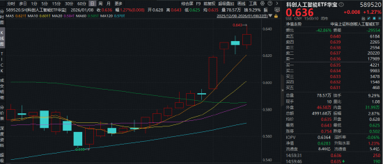 或由于"AI+制造"重磅政策发布,1月8日,重点布局国产AI产业链的科创人工智能ETF华宝(589520) 延续近期强势上涨态势,场内价格盘中拉升2.39%,收涨1.27%,上探2025年10月以来的高点,全天成 交额4991万元,环比小幅放量。 | 序号 | 名称 | 涨跌幅 * | 两日隊 | 申万一级行业 | 申万二级行业 | 申万三级行业 | 总市值 | 成交额 | | --- | --- | --- | --- | --- | --- | --- | --- | --- | | 1 | 中科雷图 | 4.79% | | 计算机 | IT题务Ⅱ | IT服务Ⅲ | 493亿 | 22.08亿 | | 2 | 复日微电 | 4.12% | now | 电子 | 丰导体 | 数字芯片设计 | 59517 | 20.324Z | | 3 | 本原股份 | 3.85% | No. Can - | 电子 | 半导体 | 散字芯片设计 | 831亿 | 42.734Z | | 4 | 意武纪-U | 3.52% | mand | 电子 | 未會体 | 数字芯片设计 | 6089亿 | 215.83 Z | | ટ ...