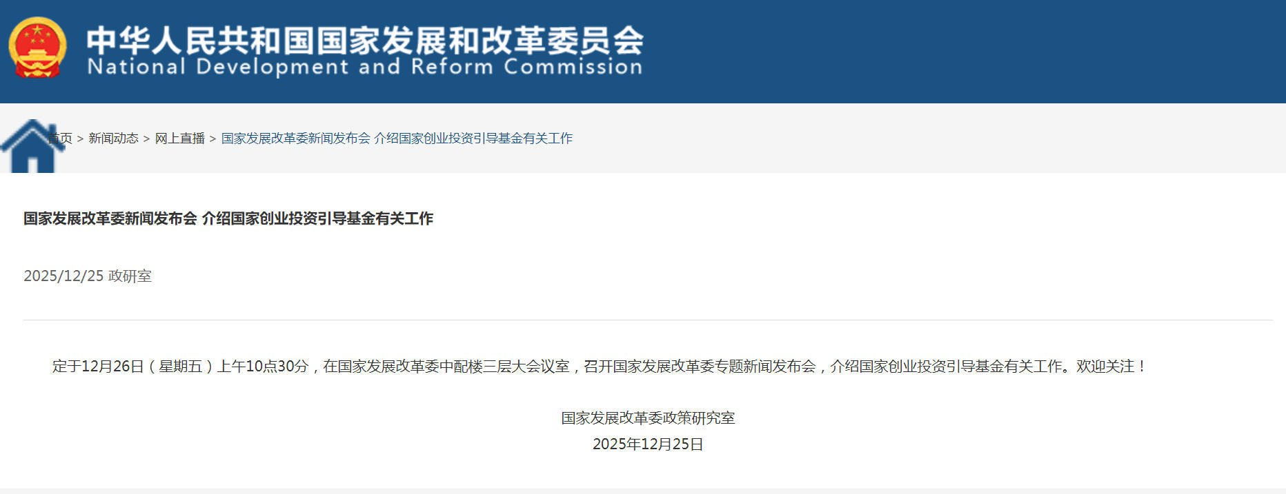 预告:国家发改委12月26日召开新闻发布会 介绍国家创业投资引导基金有关工作