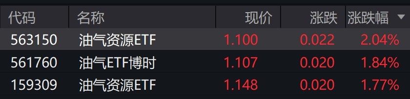Group 1 - Oil and gas concept stocks strengthened, with Jerry Holdings and Intercontinental Oil rising over 7% [1] - Oil and gas resource-related ETFs increased by approximately 2% due to the rise of heavy-weight stocks [1] Group 2 - Specific ETFs showed the following performance: - Oil and Gas Resource ETF (code: 563150) at 1.100, up 0.022 (2.04%) - Oil and Gas ETF Boshi (code: 561760) at 1.107, up 0.020 (1.84%) - Oil and Gas Resource ETF (code: 159309) at 1.148, up 0.020 (1.77%) [2] - Brokerages indicate that despite geopolitical uncertainties, the medium to long-term oil supply and demand structure remains favorable, maintaining a positive outlook on "three major oil companies" and the oil service sector [2] - The recovery of the macro economy is expected to boost chemical demand, and in the long term, the clearing of chemical product capacity is beneficial for leading enterprises, with a positive outlook on large-scale refining, coal chemical, and ethylene profitability [2]