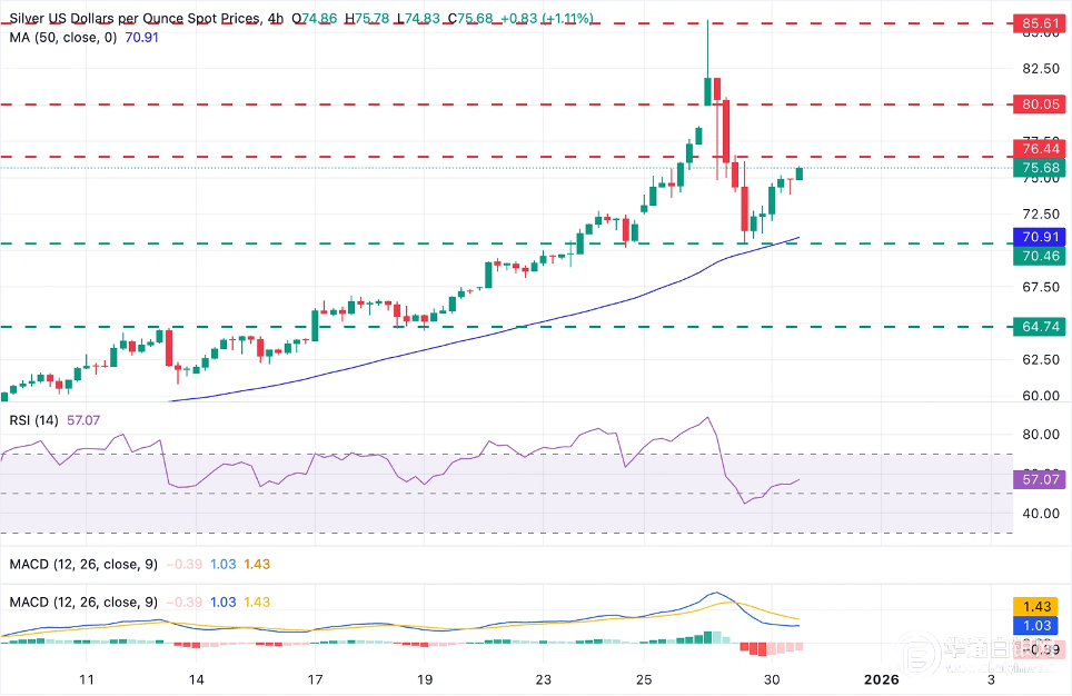 【华通白银网12月31日】•白银从70.40美元低点反弹至75.00美元区域。 •年终流动性稀薄引发了白银价格的剧烈波动。 在4小时图表中,白银在周一跌至70.53美元后,交易于75.65美元。50周期简单移动均线位于70.89美元附近,周一白银守住该水平并维持 整体上行趋势。 然而,震荡指标信号不一。异同移动均线(MACD)仍位于信号线下方,且处于零轴以下,显示看跌动能尚未完全消退;而相对强弱指 标(RSI)则已回升至关键的50分界线上方,进入看涨区间,暗示短期下行压力可能有所缓解。 日线图上的看跌吞噬模式是一个负面信号,可能预示着更深的调整。盘中阻力位位于76.50美元,之后是80.00美元的心理位和85.87美元的 历史高位。 下行方面,上述50期移动均线和周一低点70.53美元可能为潜在的看跌反转提供支撑。进一步下跌,12月18日的低点64.75美元附近将成为 焦点。 截止北京时间09:40,华通现货白银定盘价报18450元。 白银网 •白银多头可能会在75.00美元上方遇到重大阻力。 在周一流动性稀薄的情况下,白银在周二贬值超过7%后,正逐步收复部分跌幅。全球不同地区不断升级的紧张局势,加上市场预期 ...
