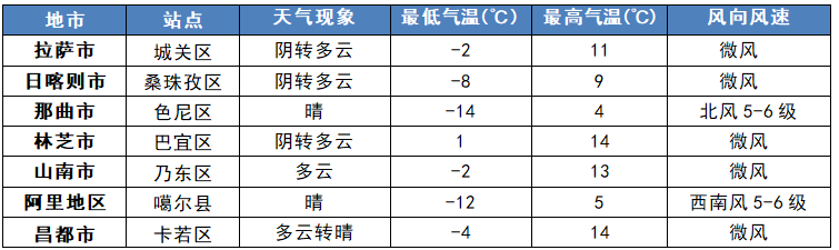 72小时趋势预报:林芝、山南南部和日喀则南部有小雪(雨),部分地方有中雪,其中林芝和山南南部高 海拔山区有大雪;昌都北部和那曲东部多云间阴天,部分地方有阵雪(雨);其他地方少云间多云。那 曲、阿里、日喀则西部和南部有7至8级大风,沿雅鲁藏布江一线有5级左右阵风。 主要城镇天气预报 | 地市 | 站点 | 天气现象 | 量低气温(℃) | 最高气温(℃) | 风向风速 | | --- | --- | --- | --- | --- | --- | | 拉萨市 | 城关区 | 阴转多云 | -2 | 11 | 微风 | | 日喀则市 | 桑珠孜区 | 阴转多云 | -8 | 9 | 微风 | | 那曲市 | 色尼区 | 晴 | -14 | র্ব | 北风 5-6级 | | 林芝市 | 巴宜区 | 阴转多云 | 1 | 14 | 微风 | | 山南市 | 乃东区 | 多云 | -2 | 13 | 微风 | | 阿里地区 | 噶尔县 | 晴 | -12 | 5 | 西南风 5-6 级 | | 昌都市 | 卡若区 | 多云转睛 | -4 | 14 | 微风 | 02 公路交通预报 未来24小时,林芝和山南有小雪(雨) ...