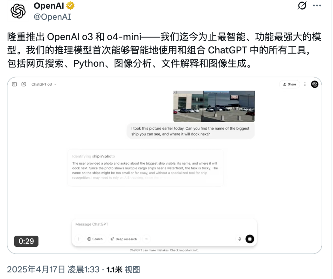 OpenAI迄今最智能的推理模型发布。 今日,OpenAI发布了最新两款o系列推理模型,分别是o3和o4-mini,这也是o系列中首次可以使用图像进行思维链推理、实现"看图思考"的模型。其中, o3是其最强大的推理旗舰模型,在编程、数学、科学、视觉感知等多个维度的基准测试中都处于领先位置;o4-mini是一个针对快速高效、成本效益推理 进行优化的较小模型,更具性价比。 视觉推理能力"首秀",具备自主执行任务能力 在两款o系列推理模型发布后,OpenAI首席执行官萨姆·奥特曼转发一名体验者的推文,并表示新模型"达到或接近天才水平"。此外,奥特曼还表示,预计 会在未来几周内将o3升级到专业版o3-pro。 据OpenAI介绍,最新发布的o3和o4-mini经过训练后,可以在做出反应前进行更长时间的思考。这是公司迄今为止发布的最智能的模型,代表着ChatGPT 能力的一次重大飞跃。 记者注意到,在半小时的线上发布会直播中,此前曾长期休假的OpenAI总裁GregBrockman(格雷格·布洛克曼)也作为发布者,向观众介绍和演示o3和o4- mini。 根据介绍及演示,o3和o4-mini主要有以下亮点: 一是性能更 ...