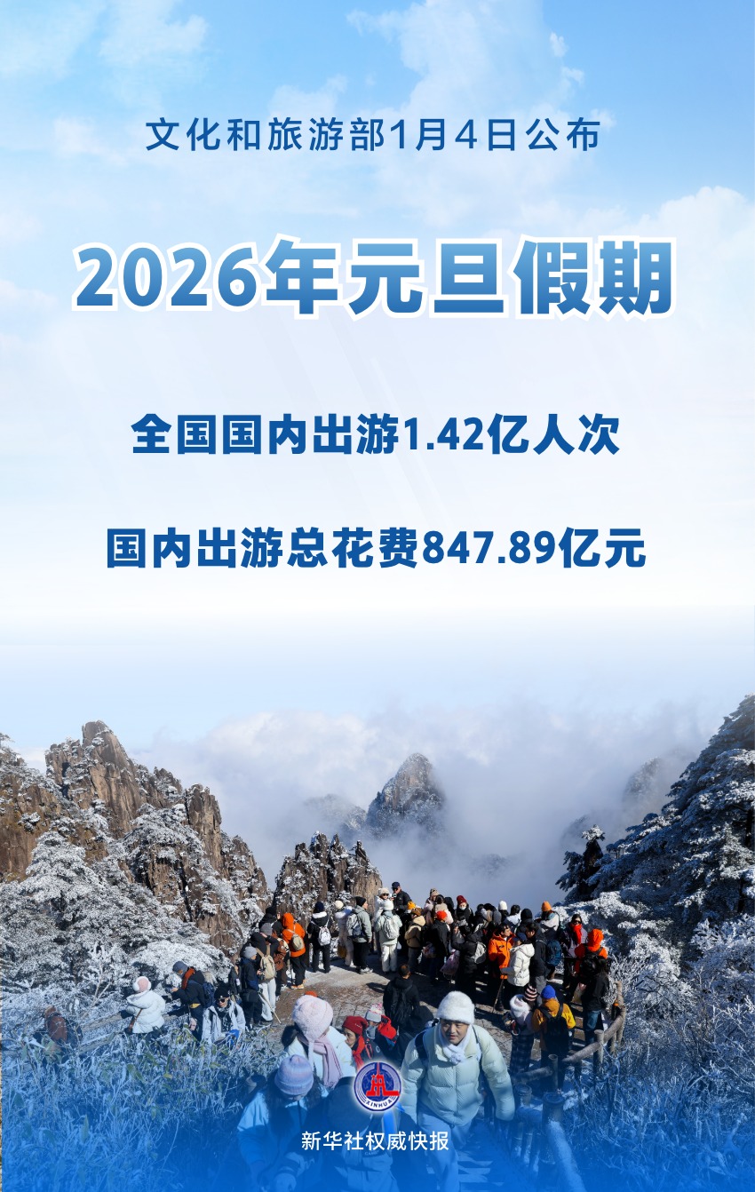 文化和旅游部1月4日公布 文化和旅游部1月4日公布2026年元旦假期文化和旅游市场情况。元旦假期3天,全国国内出游1.42亿人次,国内出游总花 费847.89亿元。 假期中,跨年游、冰雪游热力四射,短途游、度假游备受青睐,文旅消费拉满新年"仪式感"。人们在文化氛围中感受人 间烟火,在竞相出游中开启新的一年。 (文章来源:新华社) 2026年元旦假期 全国国内出游1.42亿人次 国内出游总花费847.89亿元 ...
