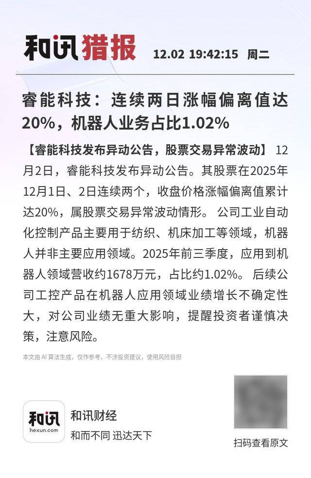 本文由 AI算法生成,仅作参考,不涉投资建议,使用风险自担 和闭猎报 12.02 19:42:15 周= 睿能科技:连续两日涨幅偏离值达 20%,机器人业务占比1.02% 【睿能科技发布异动公告,股票交易异常波动】12月2日,睿能科技发布异动公告。其股票在2025年12 月1日、2日连续两个,收盘价格涨幅偏离值累计达20%,属股票交易异常波动情形。 公司工业自动化 控制产品主要用于纺织、机床加工等领域,机器人并非主要应用领域。2025年前三季度,应用到机器人 领域营收约1678万元,占比约1.02%。 后续公司工控产品在机器人应用领域业绩增长不确定性大,对公 司业绩无重大影响,提醒投资者谨慎决策,注意风险。 和讯财经 和而不同 迅达天下 扫码查看原文 【睿能科技发布异动公告,股票交易异常波动】 12 月2日,睿能科技发布异动公告。其股票在2025年 12月1日、2日连续两个,收盘价格涨幅偏离值累计 达20%,属股票交易异常波动情形。公司工业自动 化控制产品主要用于纺织、机床加工等领域,机器 人并非主要应用领域。2025年前三季度,应用到机 器人领域营收约1678万元,占比约1.02%。后续公 司工控产品在机器 ...