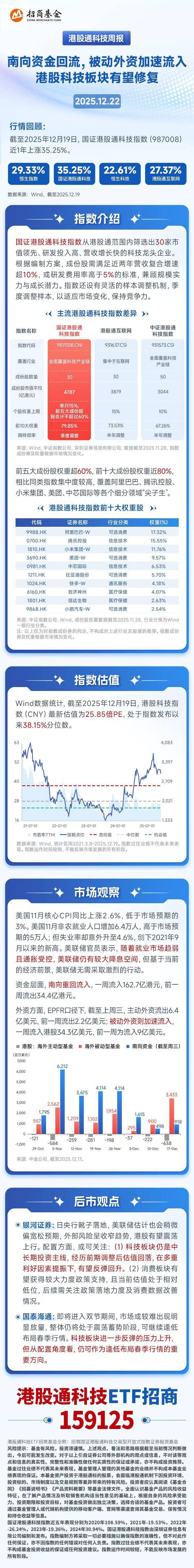 美国11月核心CPI同比上涨2.6%,低于市场预期的3%。美国11月非农就业人口增加6.4万人,高于市场预期 的5万人;但失业率却意外升至4.6%,创下2021年9月以来的新高。美联储官员表示,随着就业市场趋弱且 通胀受控,美联储仍有较大降息空间。 资金层面,南向重回流入,一周流入162.7亿港元,前一周流出34.4亿港元。 外资方面,EPFR口径下,截至上周三,主动外资流出6.4亿美元,前一周流出2.2亿美元;被动外资则加速 流入,一周流入港股34.3亿美元,前一周为流入9亿美元。 银河证券指出,日央行靴子落地,美联储估计也会稍微偏宽松预期,外部风险呈收窄趋势,港股有望震荡 上行。配置方面,或可关注:(1)科技板块仍是中长期投资主线,经历前期调整后估值回落,在多重利 好因素提振下,有望反弹回升。(2)消费板块有望获得较大力度政策支持,且当前估值处于相对低位, 后续需关注政策落地力度及消费数据改善情况。 港股通科技ETF招商(159125)跟踪国证港股通科技指数,从港股通范围内精选30家市值领先、研发投入 高、营收增长快的科技企业作为成份股,涵盖腾讯控股、阿里巴巴、小米集团、美团、中芯国际、比亚迪 股份等细分 ...