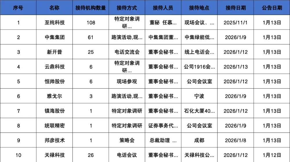 | 序号 | 名称 | 接待机构数量 | 接待方式 | 接待人员 | 接待地点 | 接待日期 | 公告日期 | | --- | --- | --- | --- | --- | --- | --- | --- | | 1 | 至纯科技 | 108 | 特定对象调 研 ... | 董秘 任慕 ... | 现场会议、 ... | 2025/11/1 | 1月13日 | | 2 | 中集集团 | 61 | 路演活动,现 ... | 中集集团董 ... | 中集绿能低 ... | 2026/1/9 | 1月13日 | | 3 | 新开普 | 25 | 电话交流会 | 董事会秘书 ... | 线上电话会 ... | 2026/1/12 | 1月13日 | | 4 | 云鼎科技 | 6 | 特定对象调 研 ... | 董事会秘书 ... | 公司1916会 ... | 2026/1/13 | 1月13日 | | 5 | 恒帅股份 | 6 | 现场参观 | 董事会秘书 ... | 公司会议室 | 2026/1/12 | 1月13日 | | 6 | 雅戈尔 | 3 | 路演活动,现 .. | 董事会秘书 ... | 宁波 | ...