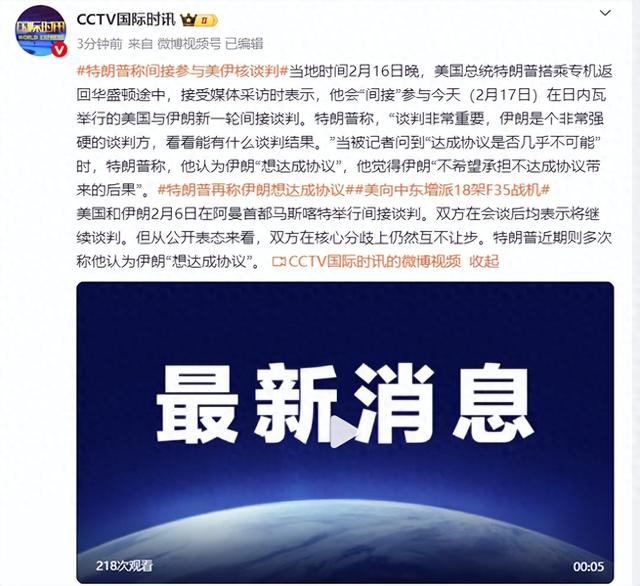 当地时间2月16日晚,美国总统特朗普搭乘专机返回华盛顿途中,接受媒体采访时表示,他会"间接"参 与今天(2月17日)在日内瓦举行的美国与伊朗新一轮间接谈判。特朗普称,"谈判非常重要,伊朗是个 非常强硬的谈判方,看看能有什么谈判结果。"当被记者问到"达成协议是否几乎不可能"时,特朗普 称,他认为伊朗"想达成协议",他觉得伊朗"不希望承担不达成协议带来的后果"。 美国和伊朗2月6日在阿曼首都马斯喀特举行间接谈判。双方在会谈后均表示将继续谈判。但从公开表态 来看,双方在核心分歧上仍然互不让步。特朗普近期则多次称他认为伊朗"想达成协议"。 ...